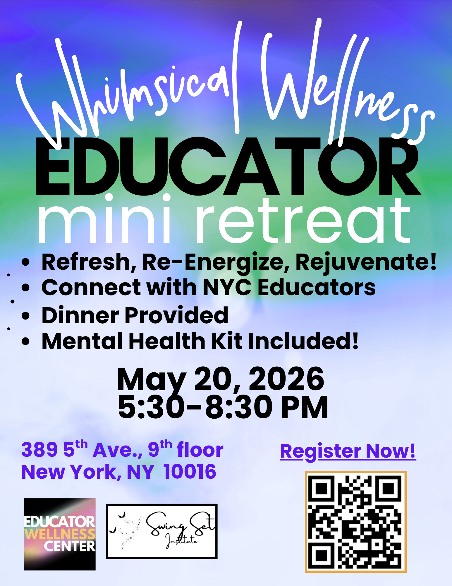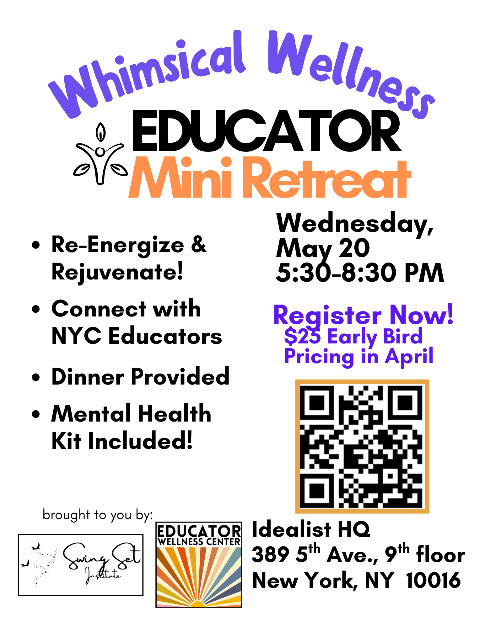 Join the Educator Wellness Center and the Swing Set Institute in NYC on May 20, 5:30-8:30 for some whimsical wellness!